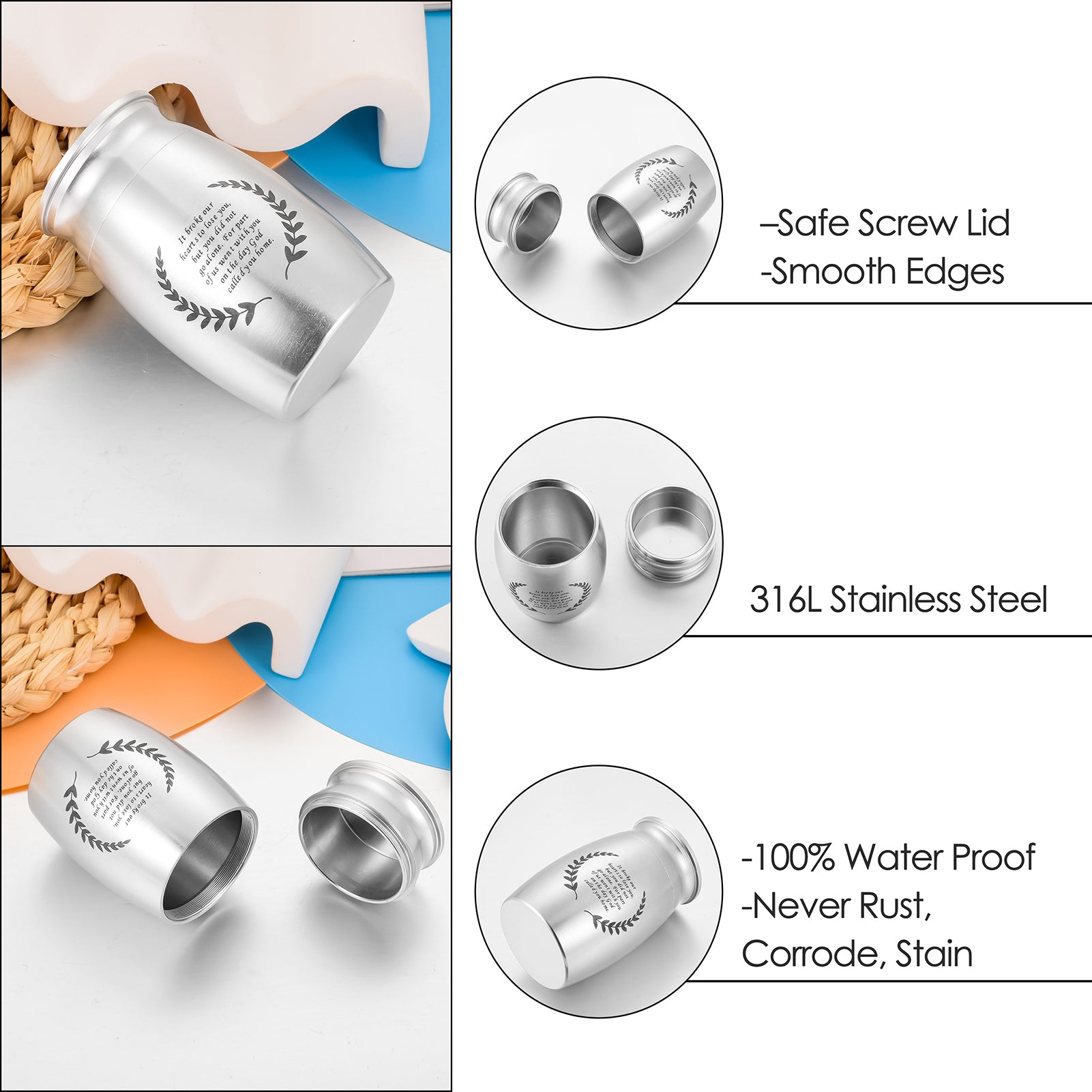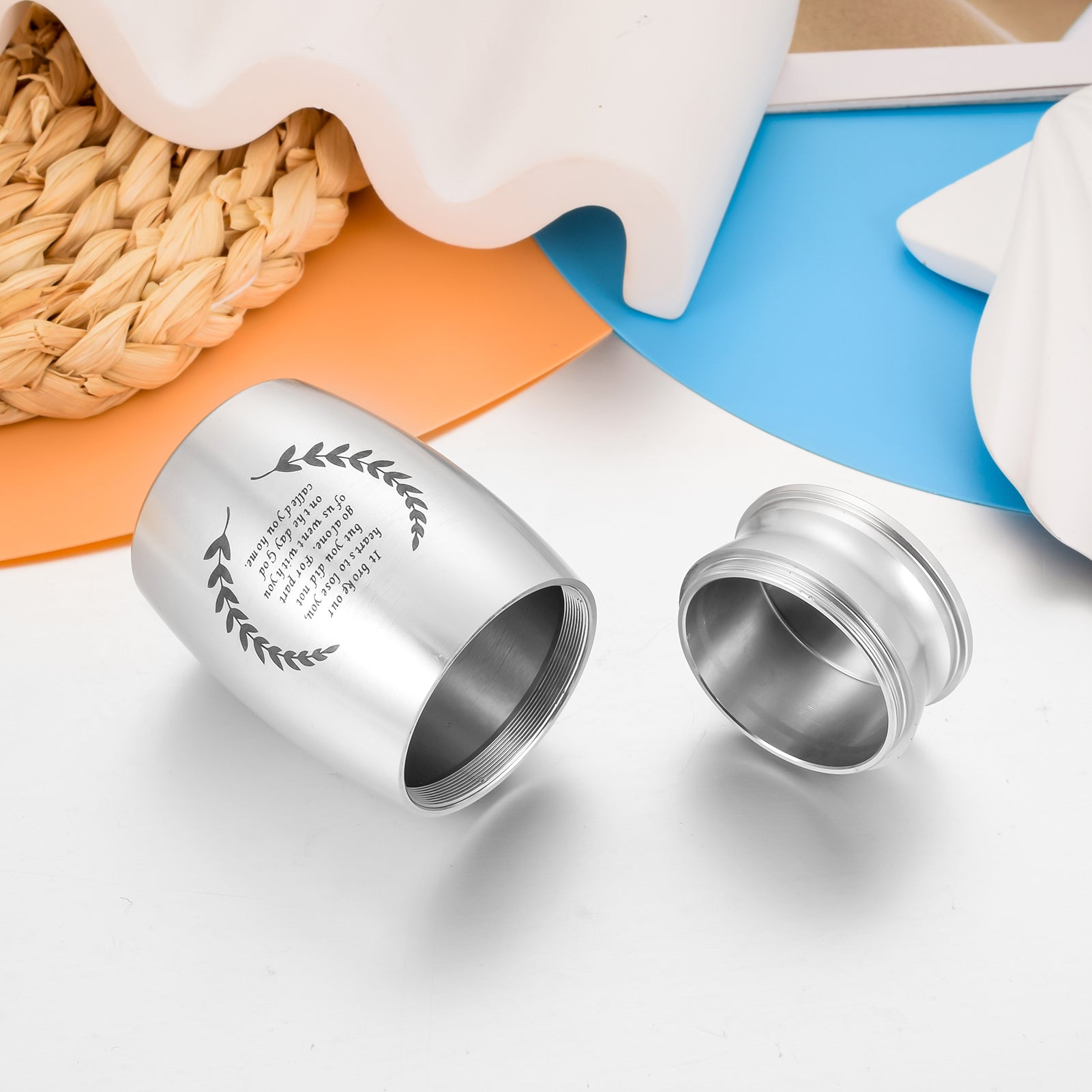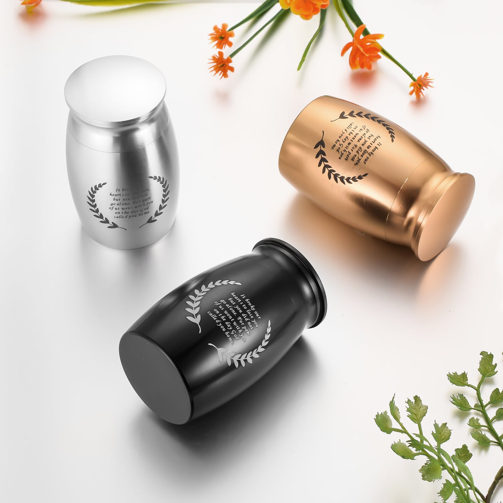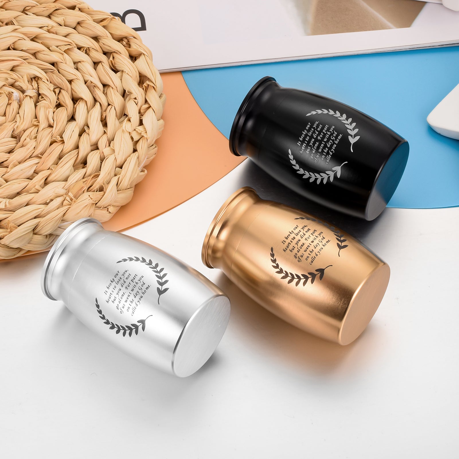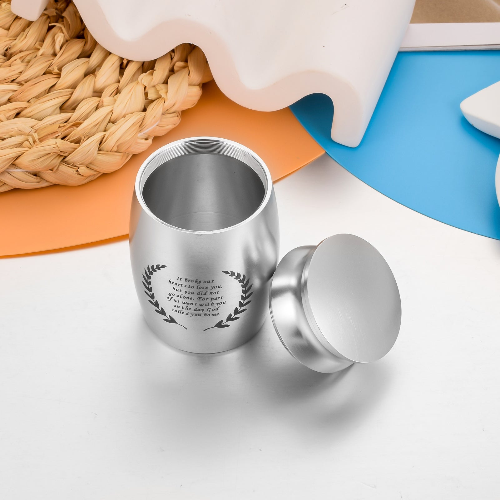 - Description: These memorial urns are crafted from aluminum and available in three finishes: silver, rose gold, and black. Each urn features an engraved laurel wreath design surrounding a poignant message: “It broke our hearts to lose you, but you did not go alone. For part of us went with you on the day God called you home.” With a sleek, cylindrical shape and a secure lid, they serve as dignified and heartfelt keepsakes to honor the memory of loved ones.