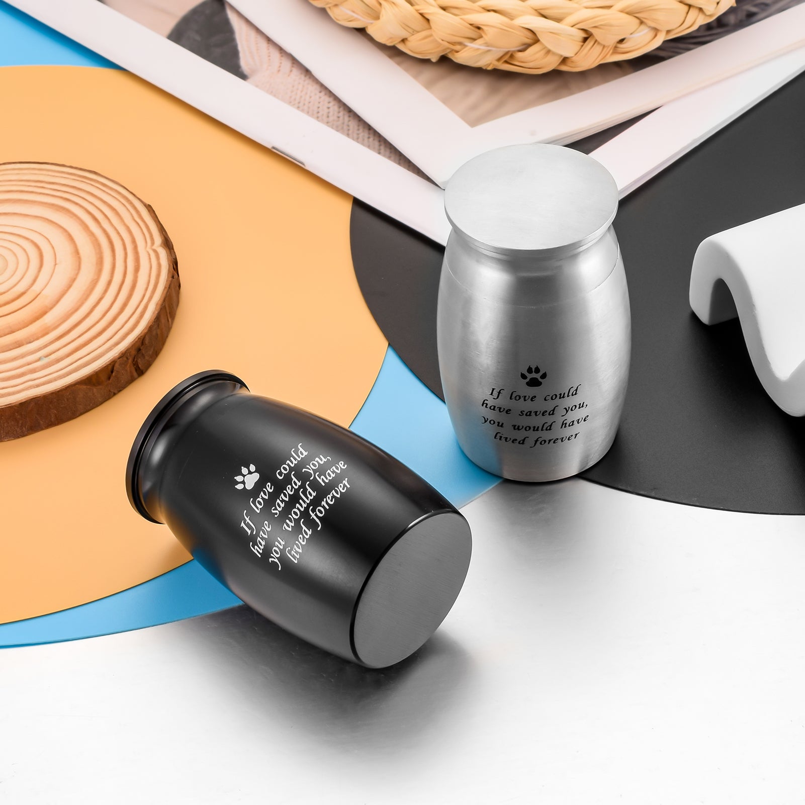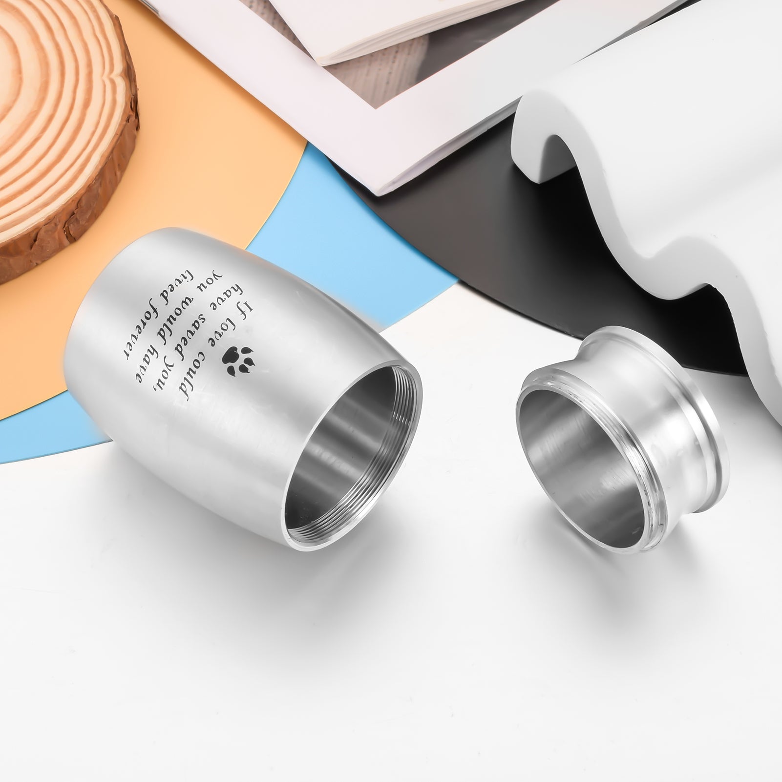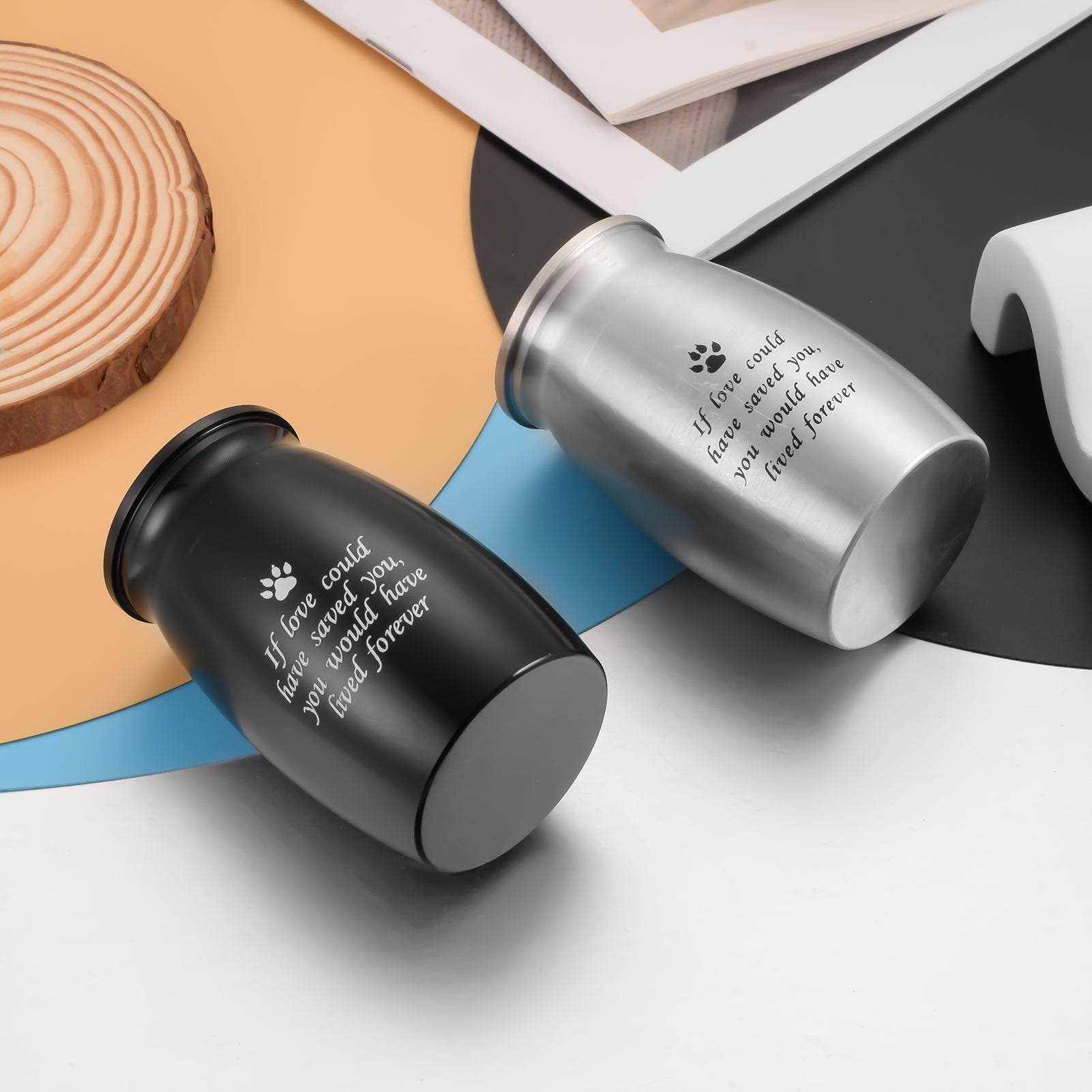 - Description: These pet memorial urns are crafted from aluminum and available in silver and black finishes. Each urn features an engraved paw print paired with the heartfelt phrase “If love could have saved you, you would have lived forever”. With a sleek, rounded cylindrical shape and a secure lid, they serve as dignified, loving keepsakes to honor the memory of beloved pets, offering a tender tribute to furry family members who have passed.