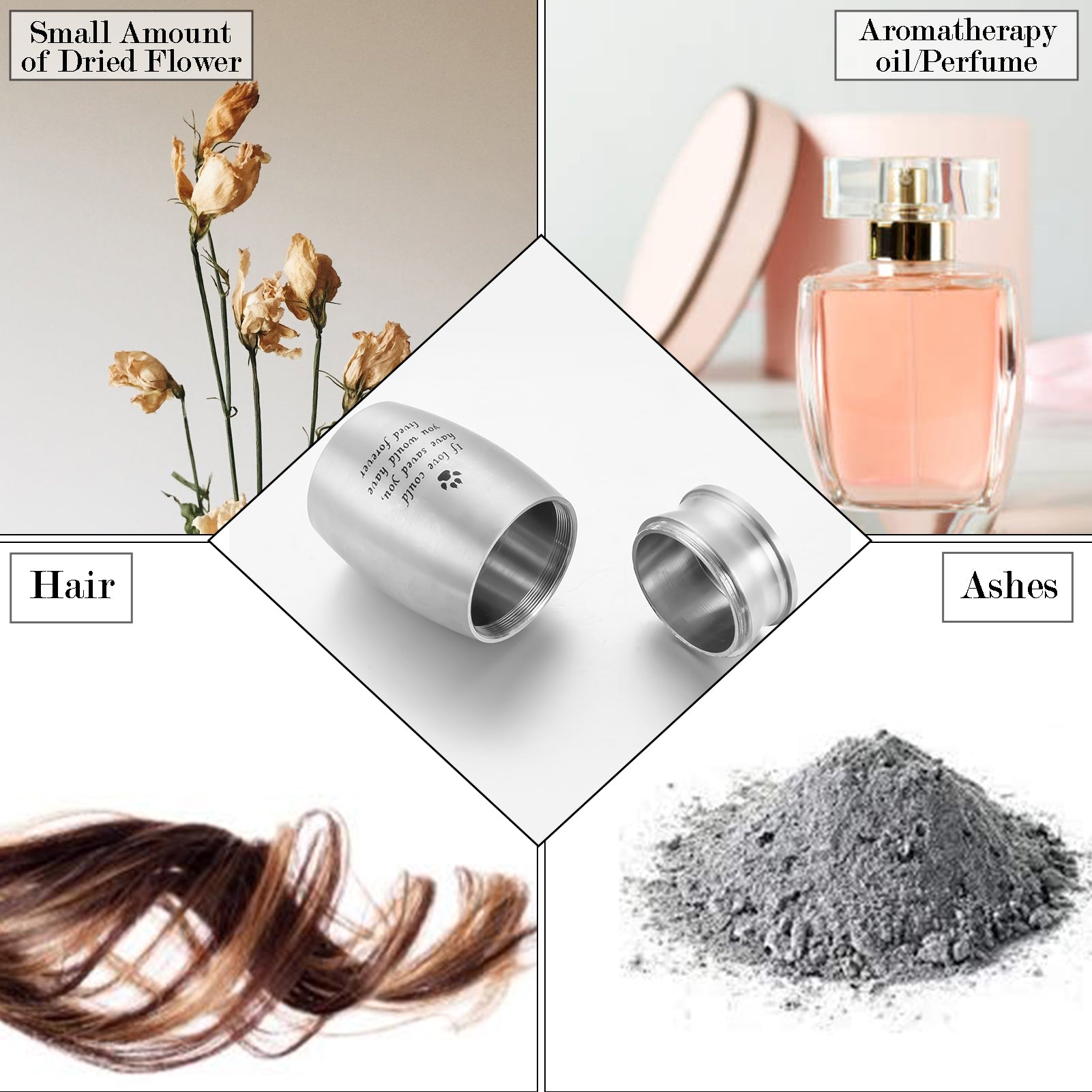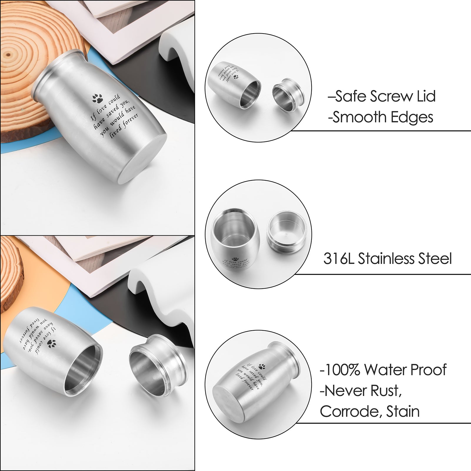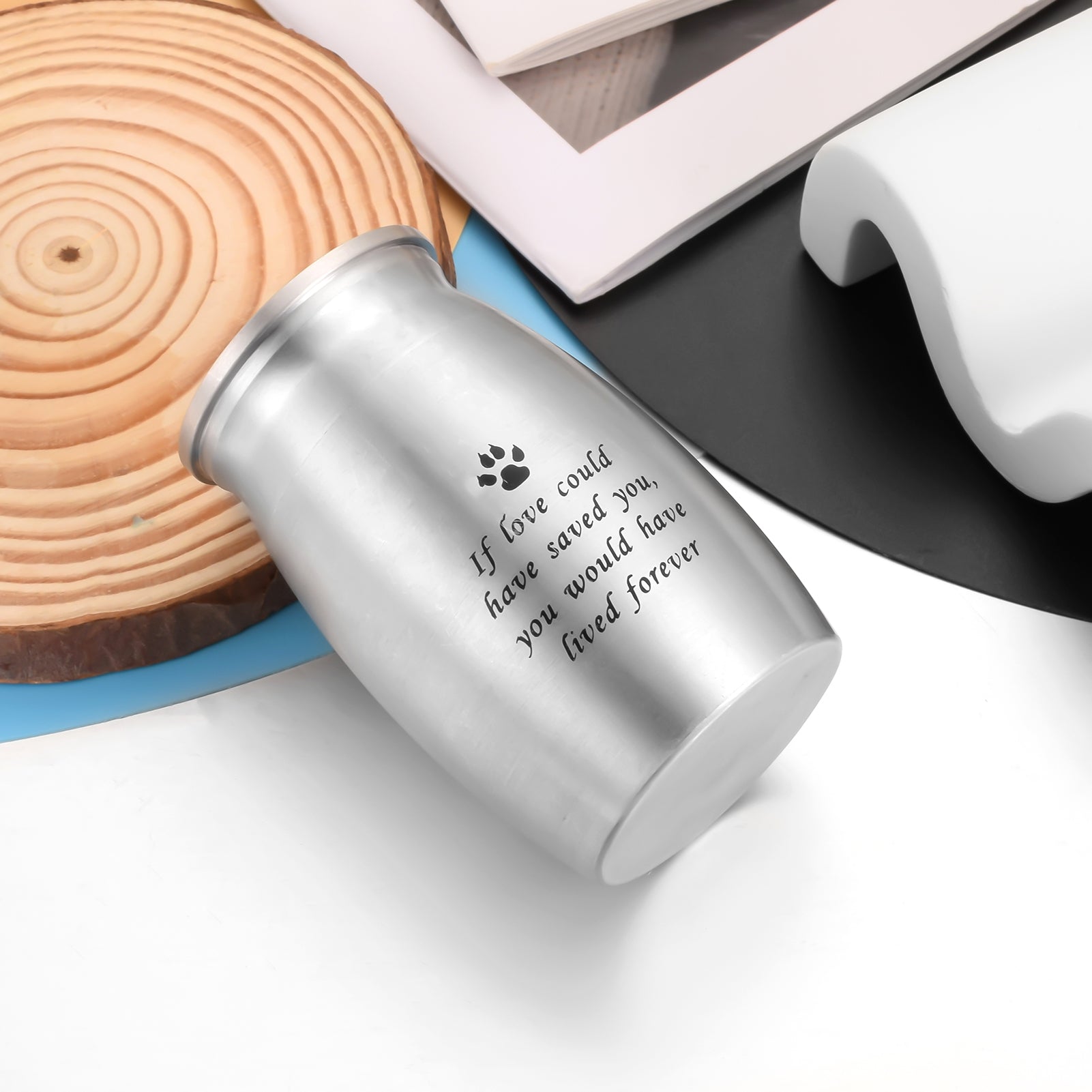 - Description: These pet memorial urns are crafted from aluminum and available in silver and black finishes. Each urn features an engraved paw print paired with the heartfelt phrase “If love could have saved you, you would have lived forever”. With a sleek, rounded cylindrical shape and a secure lid, they serve as dignified, loving keepsakes to honor the memory of beloved pets, offering a tender tribute to furry family members who have passed.