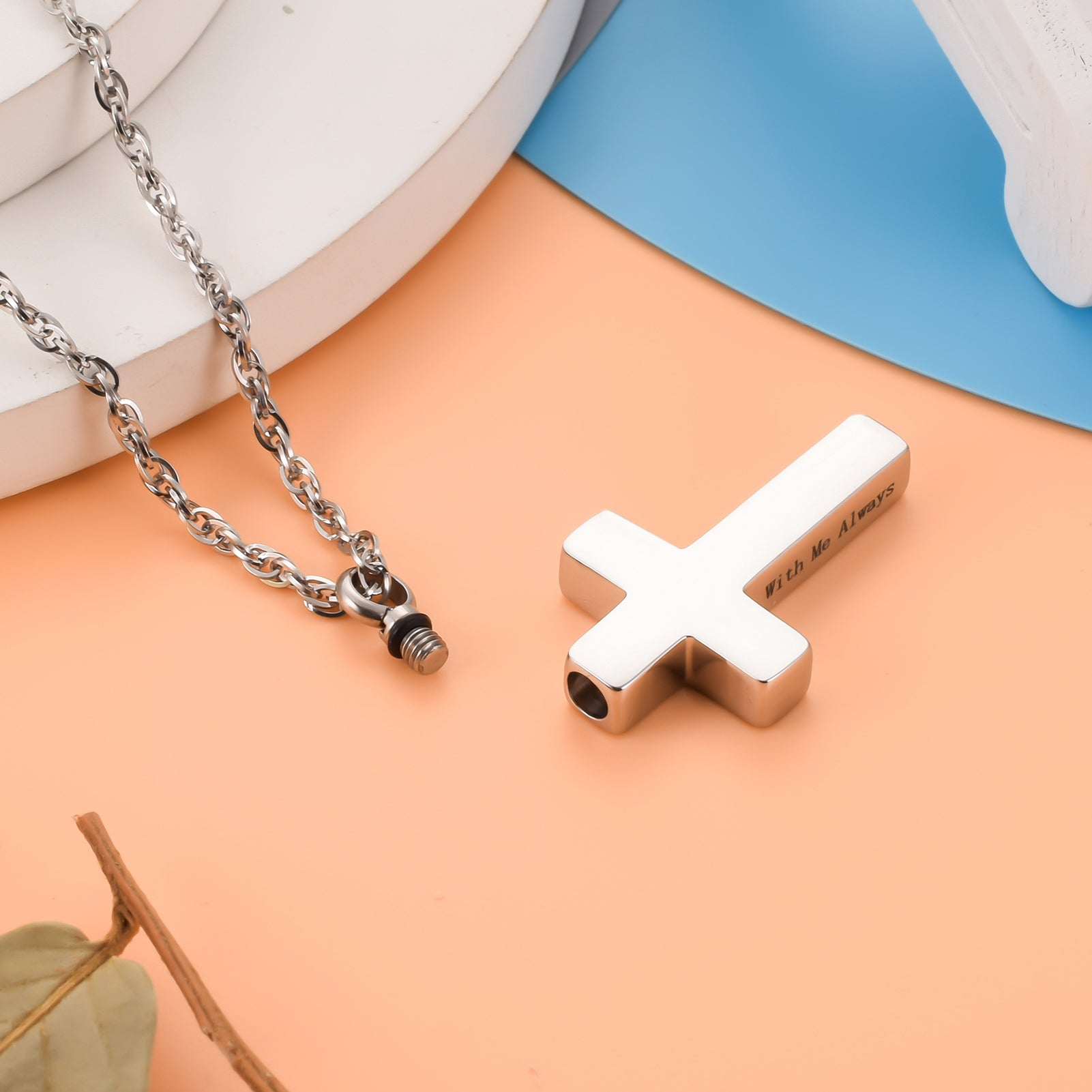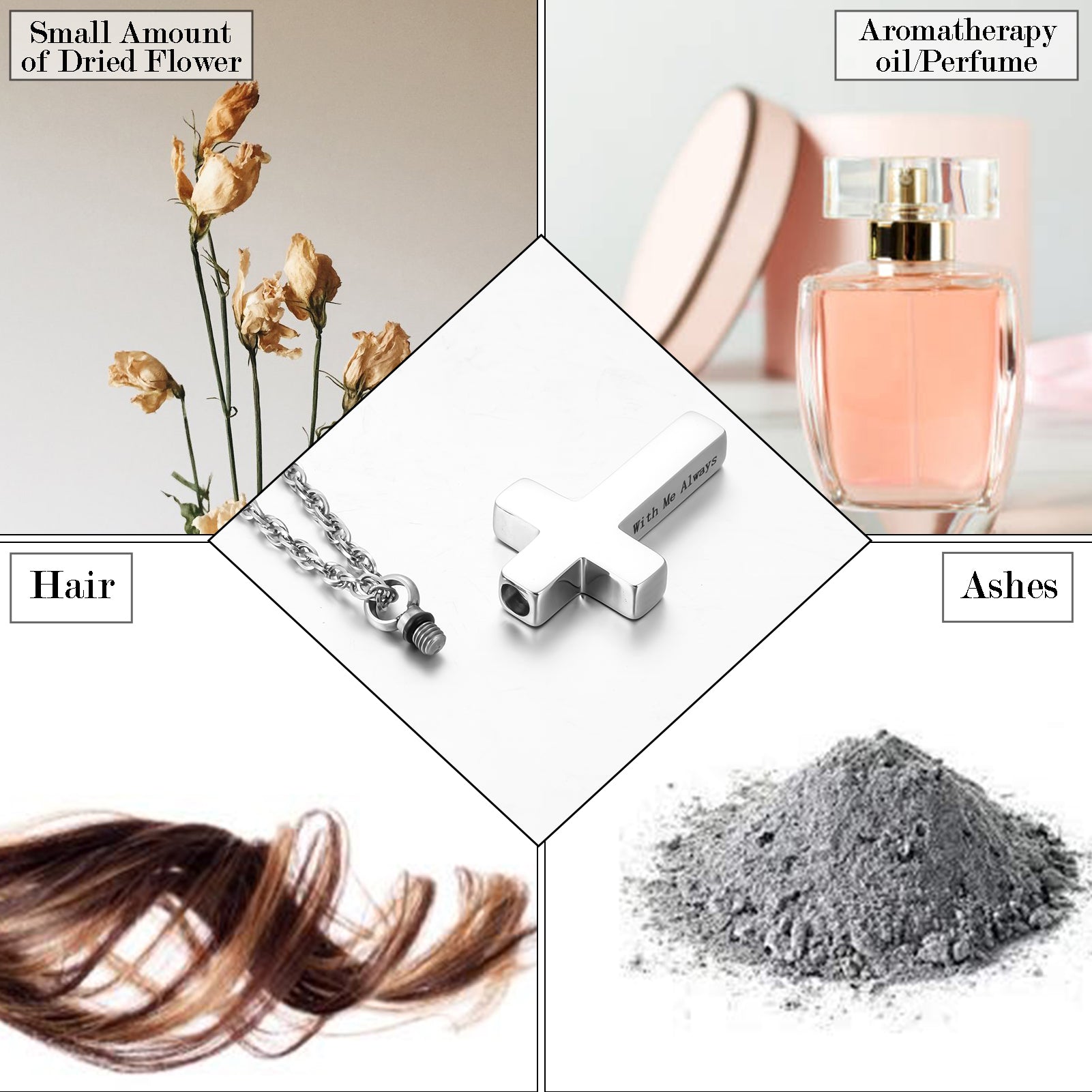 - Description: These cross shaped memorial urn pendants offered black and silver finishes, each piece features the inscription “with Me Always” and a compartment for storing small memorial items like ashes.