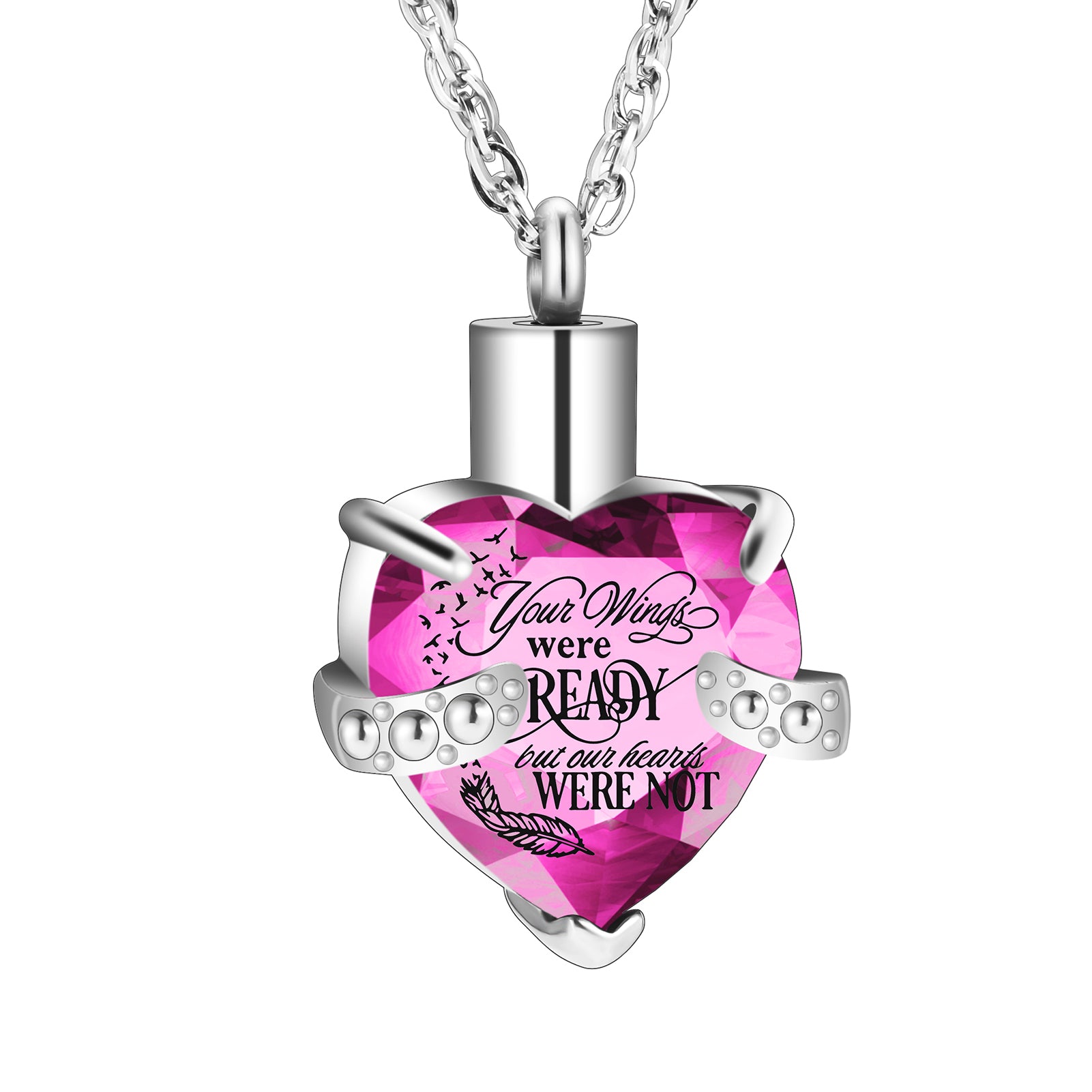 - Description: This memorial keepsake is a heart - shaped urn pendant necklace, crafted to hold tiny mementos (like ashes) of a beloved person or pet. The pendant bears the poignant inscription "Your Wings were ready but my Heart was not". It is adorned with an intricately detailed wing charm featuring a rose motif, a sparkling crystal dangle, and offers customization options—variations with engravings such as "Dad", "Mom", or a paw print are available, making it a deeply personalized tribute to cherish memories of loved ones.