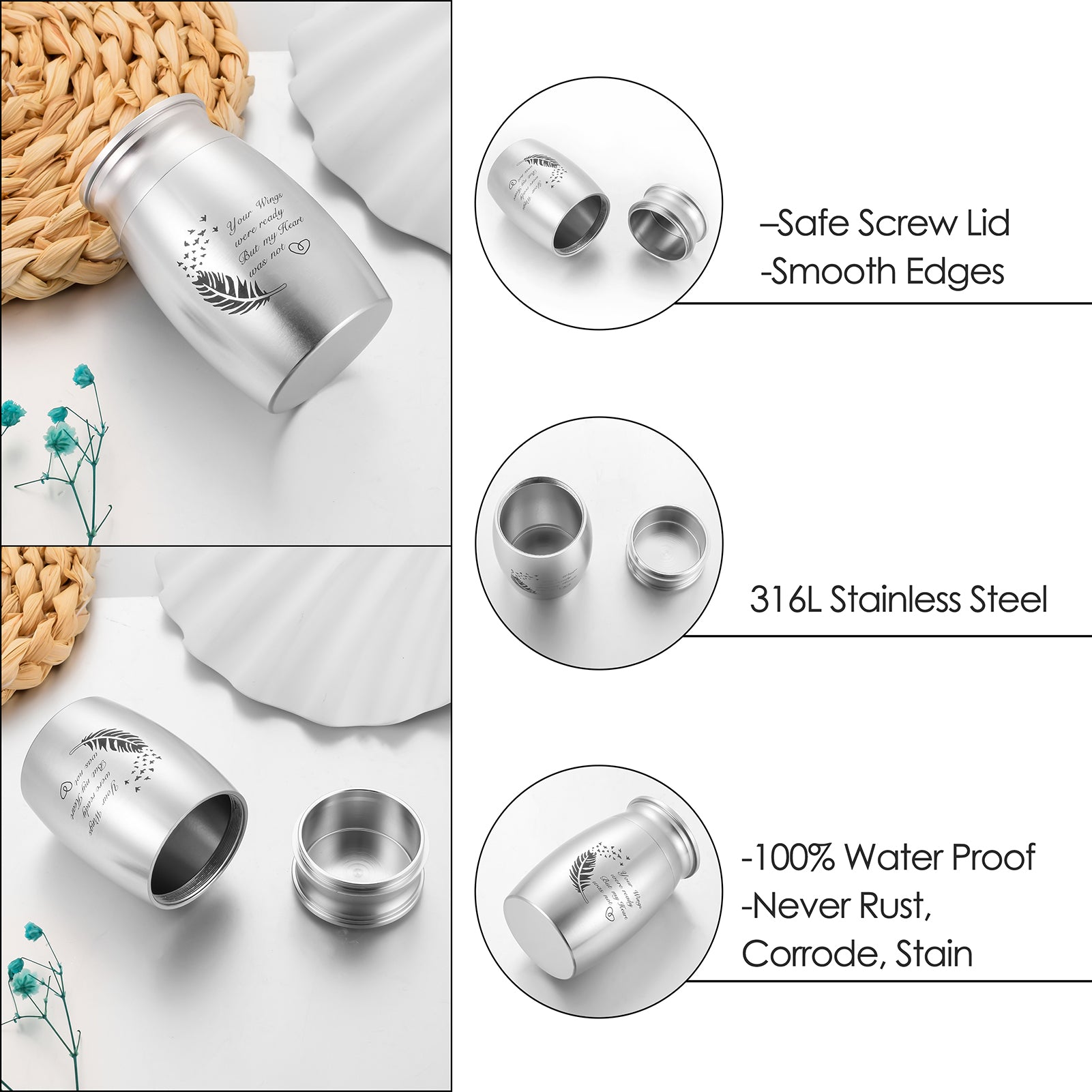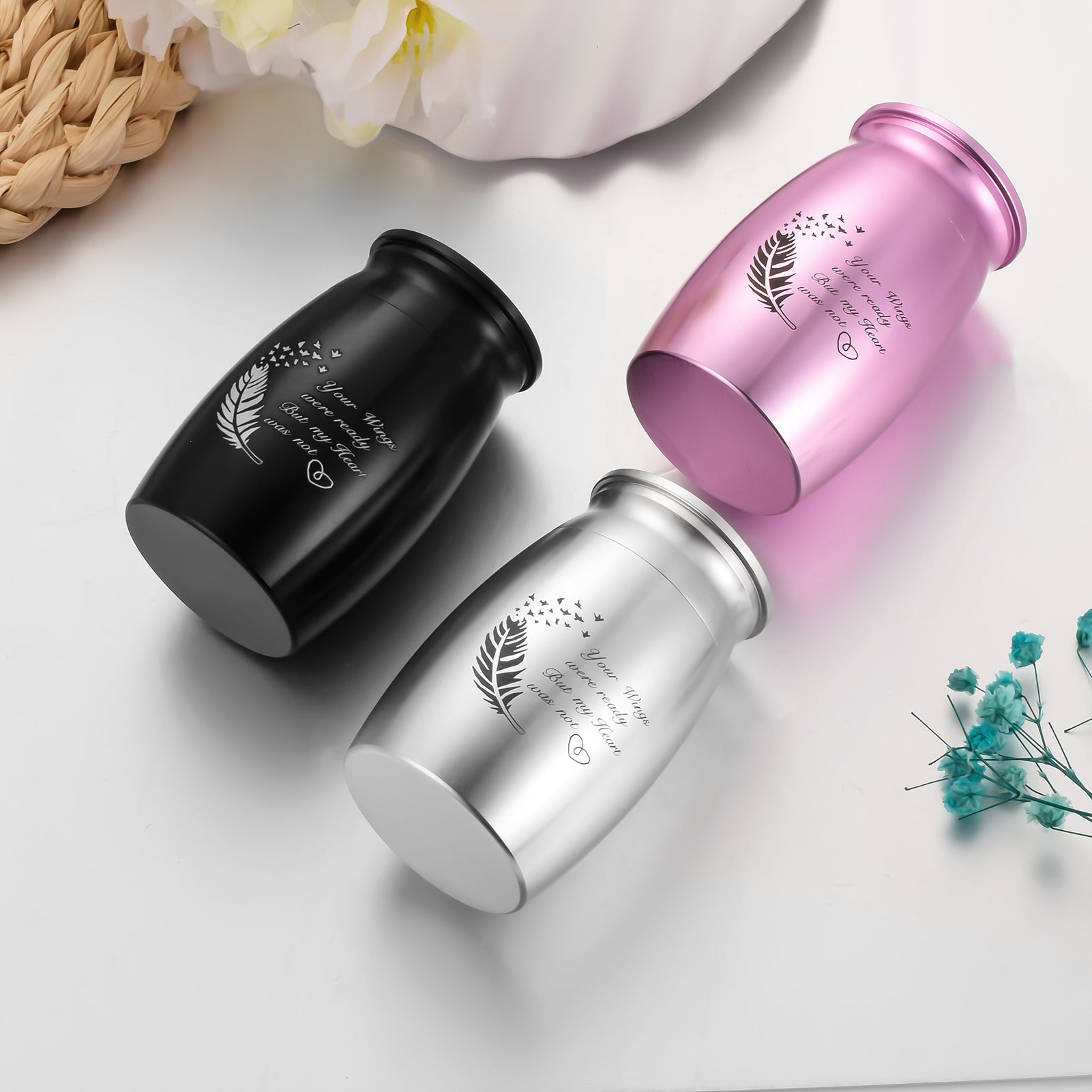 - Description: These memorial urns are crafted from aluminum and available in three finishes: silver, black, and pink. Each urn features an engraved design with a feather, flocks of birds, and the poignant phrase “Your Wings were ready But my Heart was not” (accompanied by a small heart symbol). With a sleek, rounded cylindrical shape and a secure lid, they serve as dignified, heartfelt keepsakes to honor the memory of loved ones, offering a tender tribute to those who have passed.
