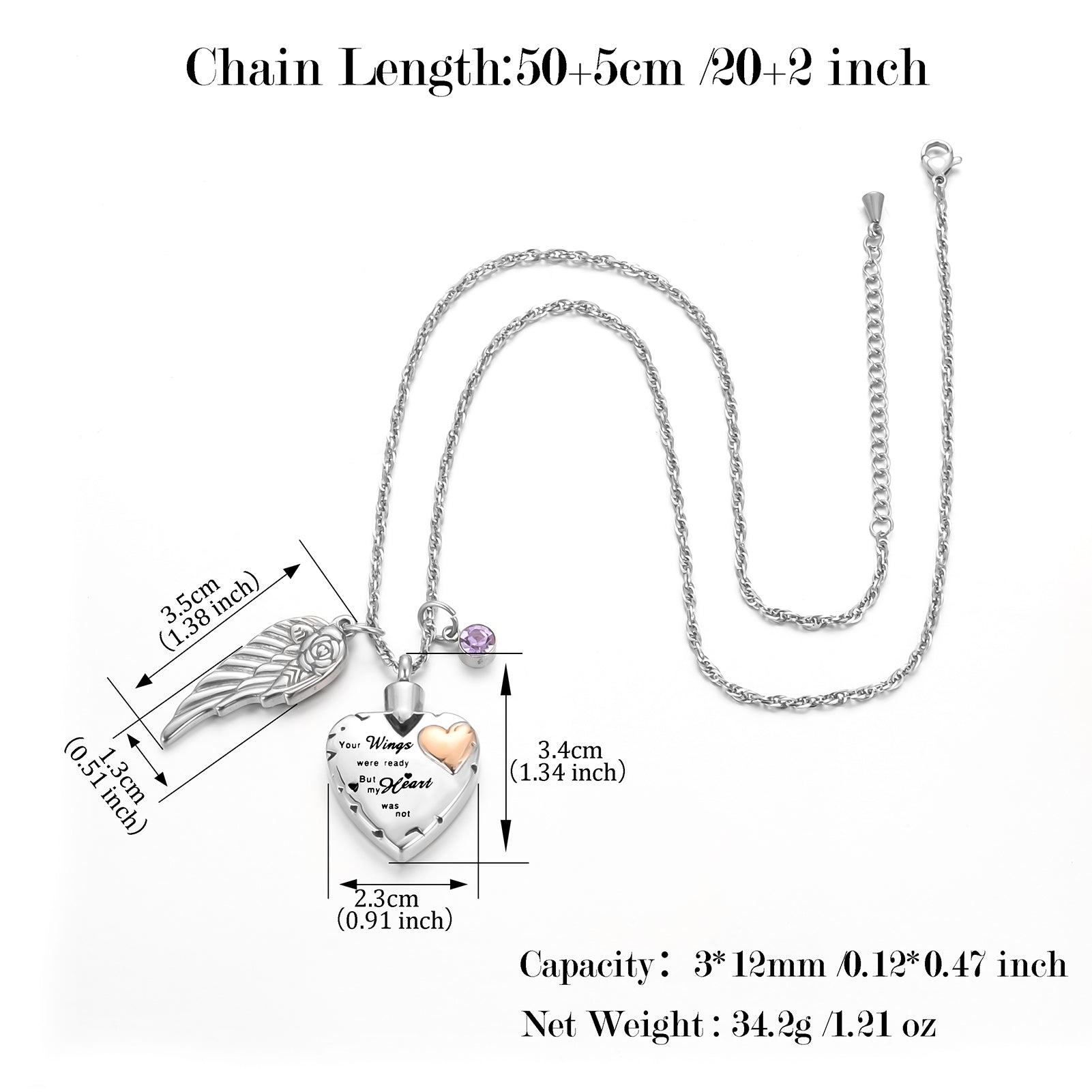 - Description: This memorial pendant showcases a heart-shaped design engraved with the poignant phrase "Your Wings were ready But my Heart was not". It includes a delicate wing charm, a rose accent, and a compartment (ideal for holding a small memento, such as ashes or a token of a loved one). Additionally, a set of colorful crystal charms is provided, allowing for personalization. Blending sentimental wording with elegant details like the wing and rose, this piece serves as a touching tribute to honor and remember loved ones.