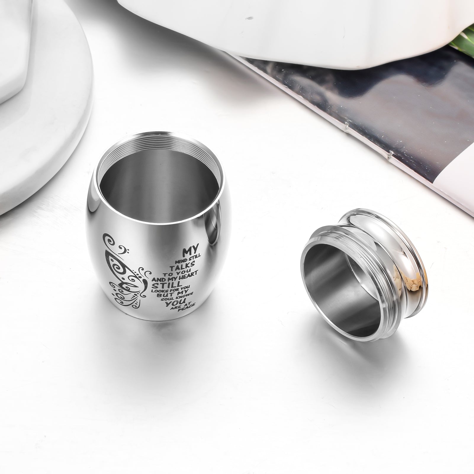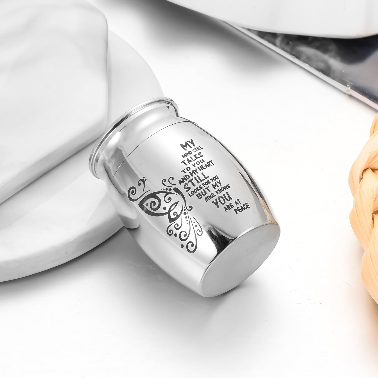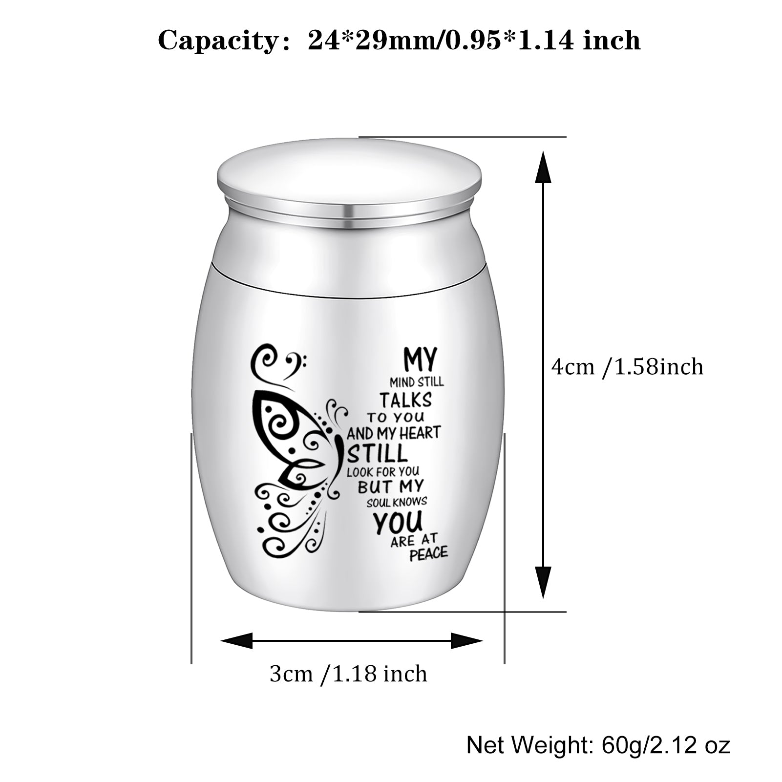 - Description: This memorial keepsake is a sleek silver urn crafted to hold the ashes of a beloved individual. It features an elegant, swirling butterfly design alongside the heartfelt inscription: "MY mind still TALKS TO YOU AND MY HEART STILL LOOKS FOR YOU BUT MY SOUL KNOWS YOU ARE AT PEACE".