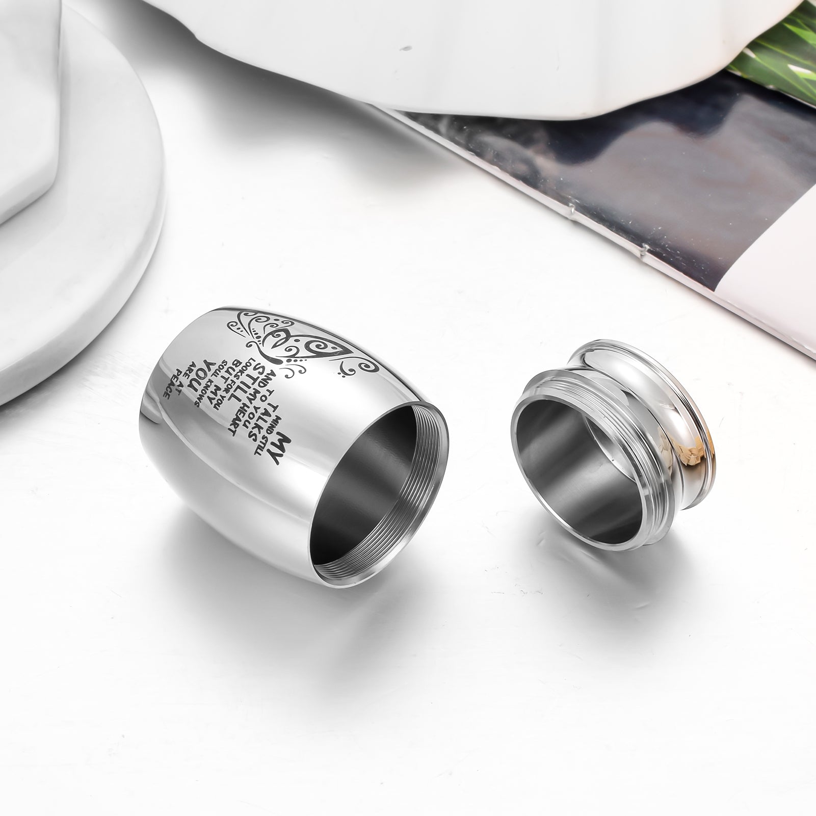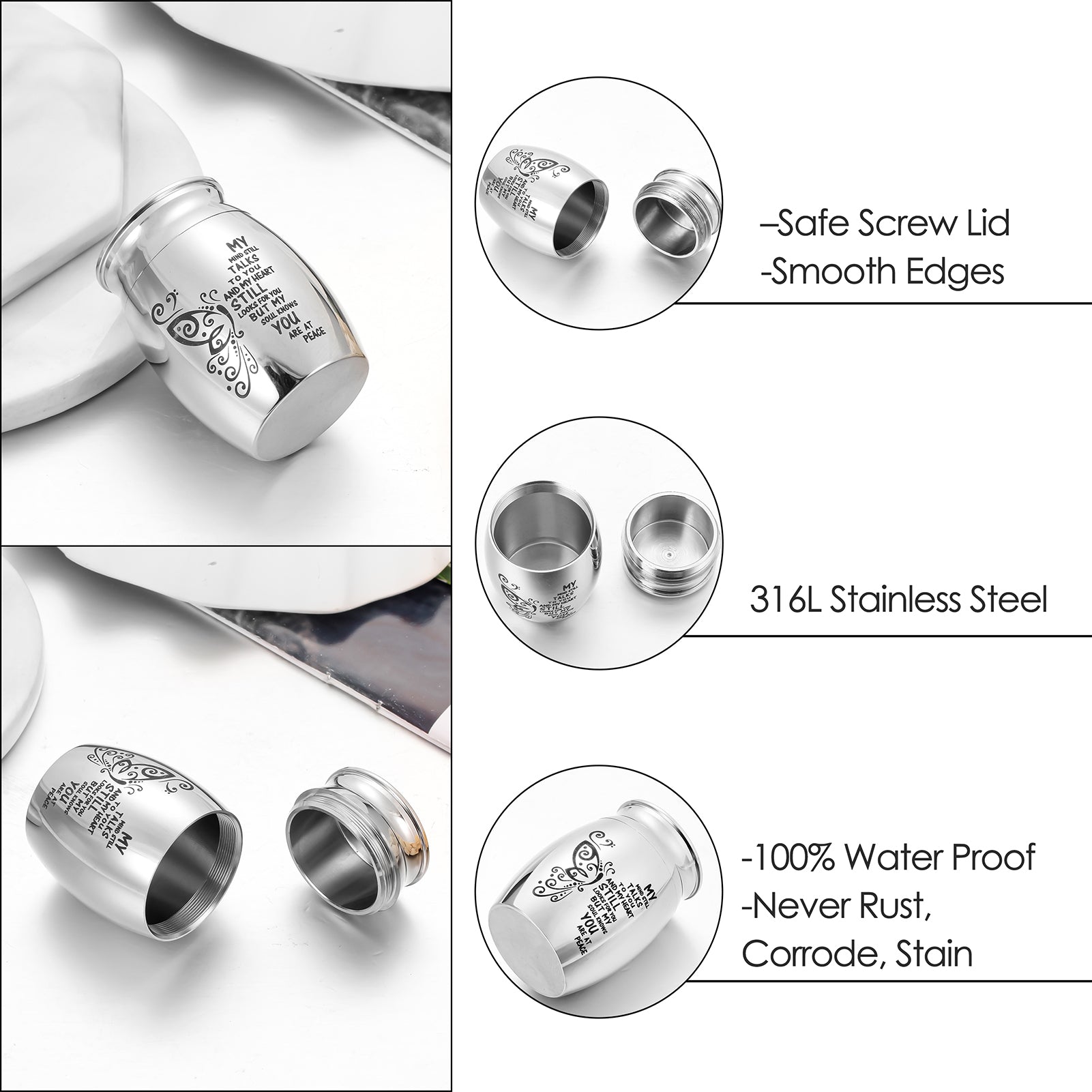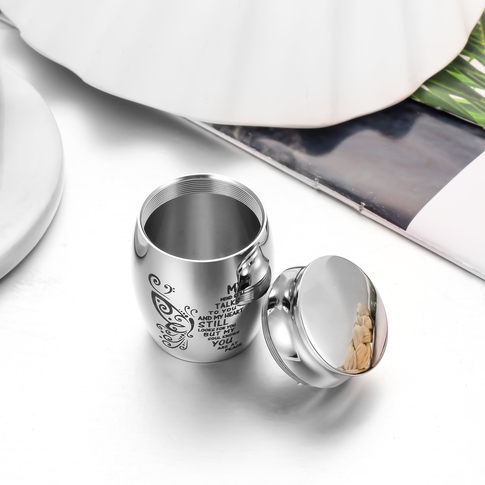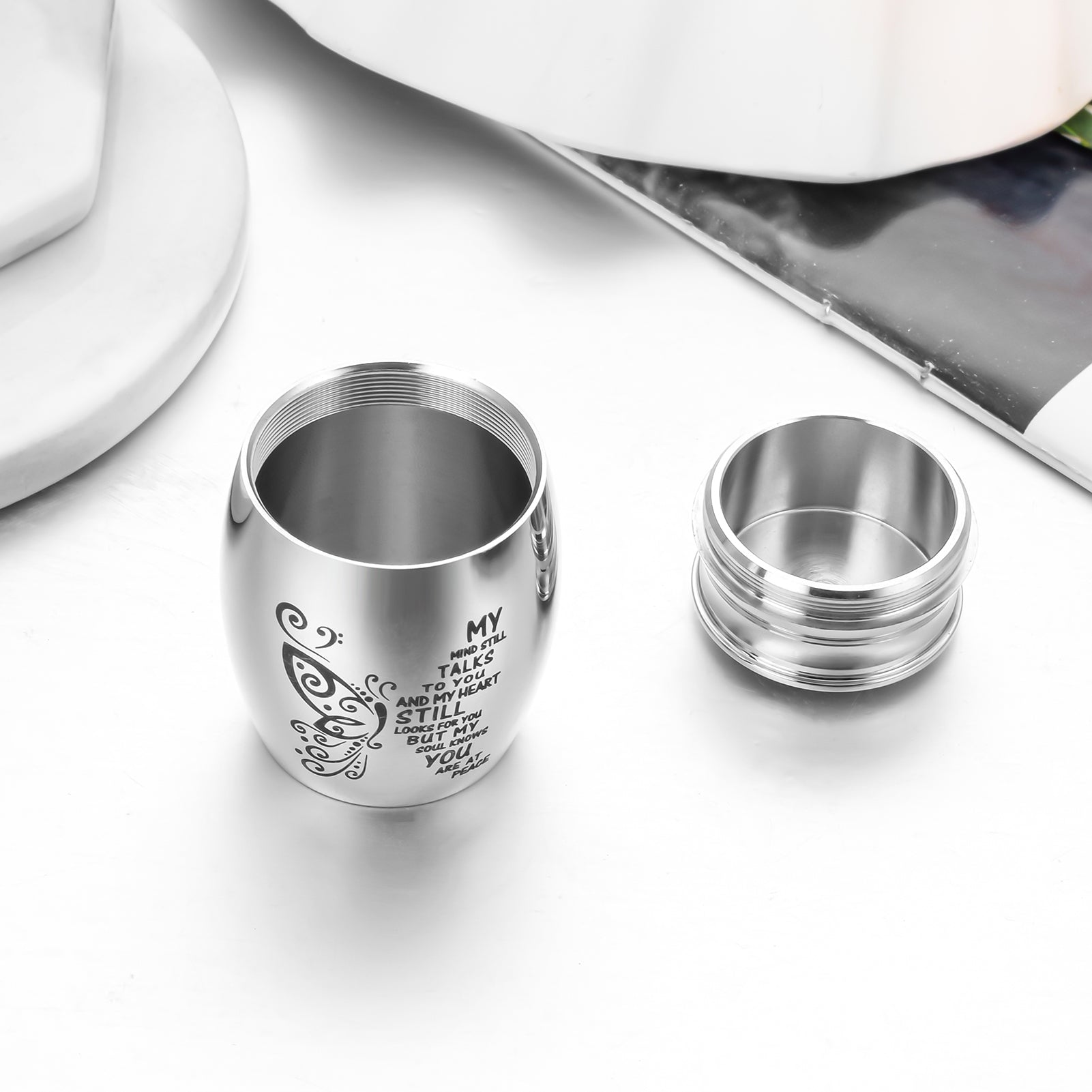 - Description: This memorial keepsake is a sleek silver urn crafted to hold the ashes of a beloved individual. It features an elegant, swirling butterfly design alongside the heartfelt inscription: "MY mind still TALKS TO YOU AND MY HEART STILL LOOKS FOR YOU BUT MY SOUL KNOWS YOU ARE AT PEACE".